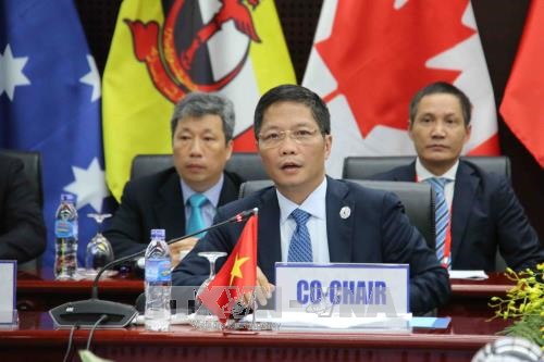 Bộ trưởng Công Thương Trần Tuấn Anh thông báo về kết quả Cuộc họp cấp Bộ trưởng các nước tham gia Hiệp định Đối tác xuyên Thái Bình Dương (TPP) do Việt Nam và Nhật Bản đồng chủ trì hồi tháng 11/2017. (Ảnh: TTXVN)