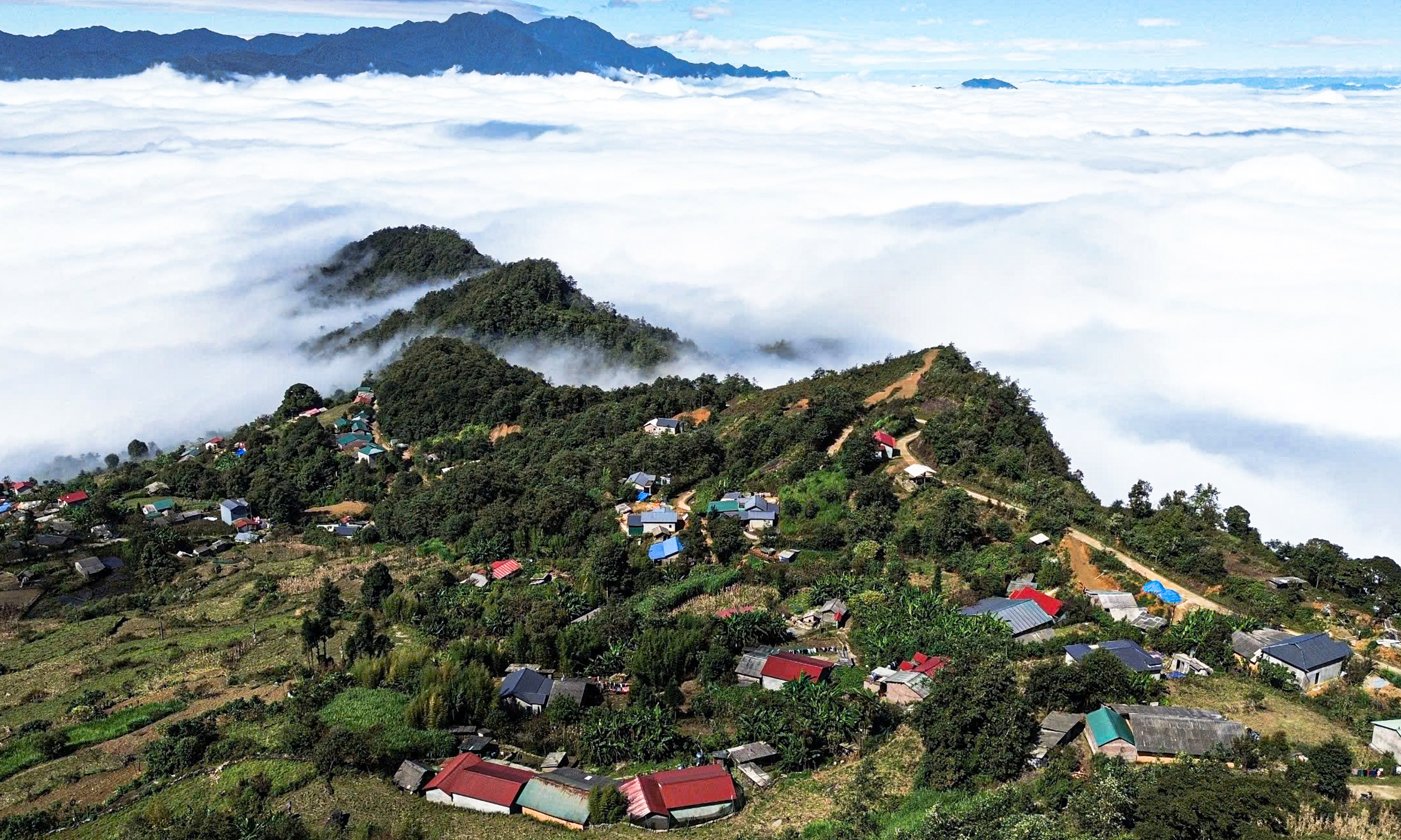 Từ vị trí này, những mái nhà trình tường, ruộng bậc thang và cả thung lũng phía dưới ẩn hiện mờ ảo trong “biển mây” trải rộng.