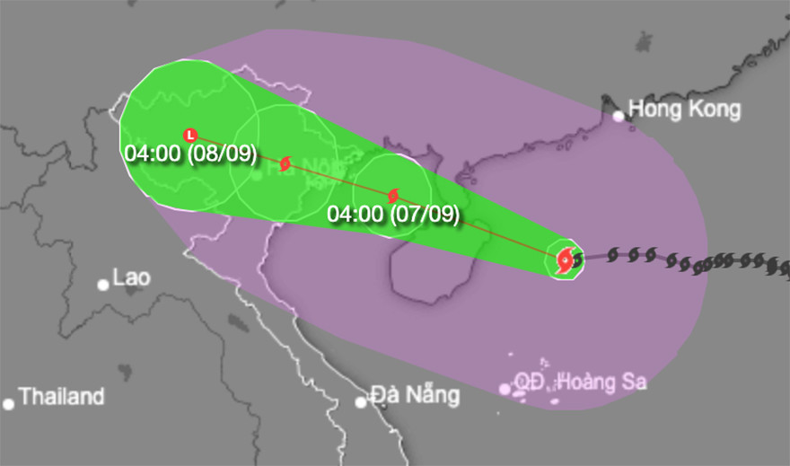 Dự báo đến 4h ngày 8/9, vị trí tâm bão trên khu vực phía Tây Bắc Bộ, bão di chuyển theo hướng Tây Tây Bắc, tốc độ khoảng 20km/h, đi sâu vào đất liền và suy yếu dần thành một vùng áp thấp.