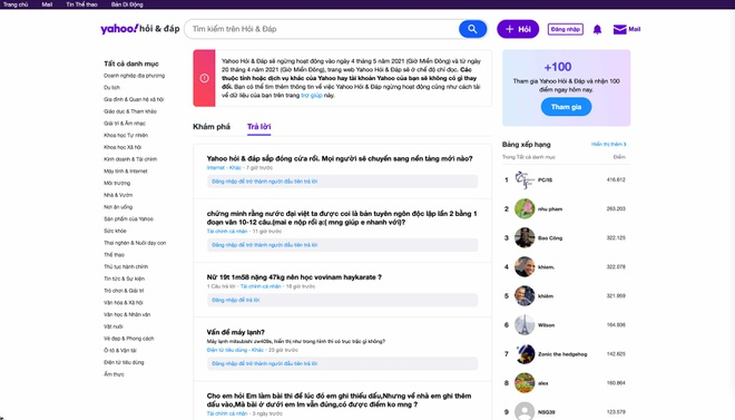 Thông báo đóng cửa Yahoo Answers được công bố trên trang chủ dịch vụ. Từ 20/4, nền tảng này sẽ không còn chấp nhận câu hỏi mới. Người dùng có thể tải về dữ liệu như câu hỏi, câu trả lời và hình ảnh đến ngày 30/6.
