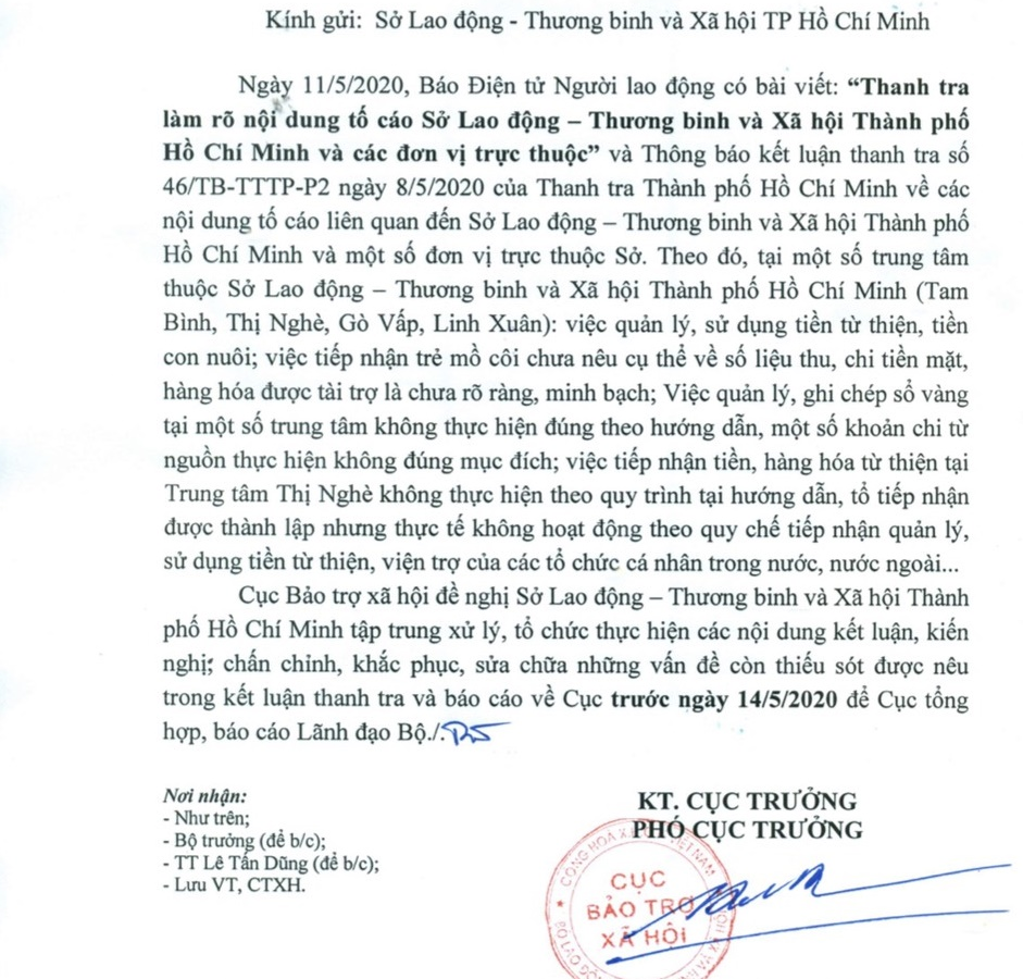 Ngày 12/5, sau khi Thanh tra TP.HCM công bố kết luận thanh tra liên quan tới những sai phạm tại Sở Lao động Thương binh và Xã hội (LĐTB&XH), Cục Bảo trợ xã hội (Bộ LĐTB&XH) vừa có văn bản gửi đến Sở LĐTB&XH TP.HCM yêu cầu xử lý, chấn chỉnh các vấn đề còn thiếu sót, báo cáo Cục trước ngày 15/4 để Cục tổng hợp, báo cáo Bộ.
