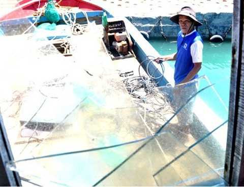 | Kính trên tàu của ngư dân Việt Nam bị nhóm người Trung Quốc dùng búa, xà beng đập vỡ ở vùng biển Hoàng Sa. Ảnh: Trí Tín/Vnexpress |