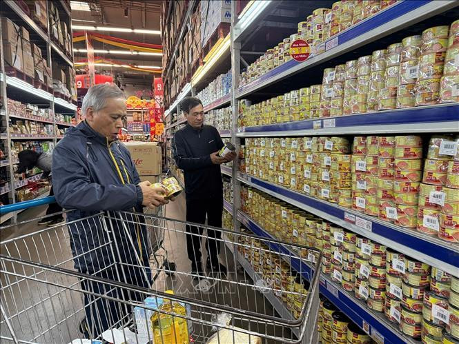 Người dân kiểm tra đồ hộp kỹ trước khi mua. (Ảnh: Tiến Vĩnh/TTXVN)