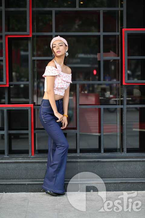 | Để nổi bật hơn khi xuống phố, Lại Thanh Hương phá cách với khăn lụa quấn quanh đầu kiểu turban phối cùng áo hở vai điệu đà và quần jeans ống loe của thập niên 1970. |