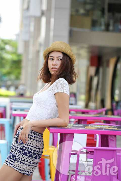 | Dạo phố Sài Gòn mùa mưa không gì lý tưởng hơn một chiếc quần shorts vải cotton thoáng mát, mềm mại. Quần in họa tiết hình học kết hợp với áo cut-out ren xinh xắn vô cùng trẻ trung và dễ thương. |