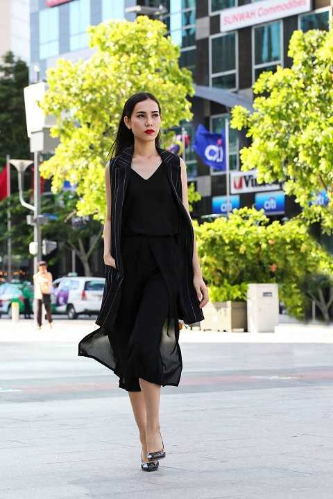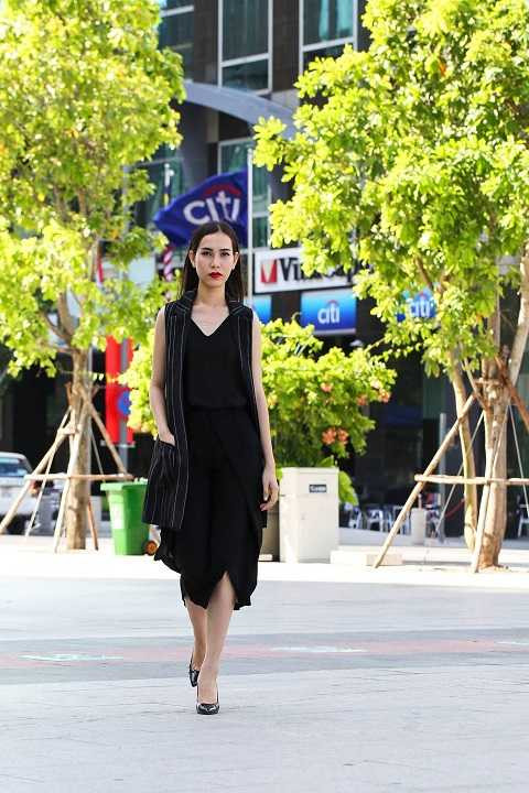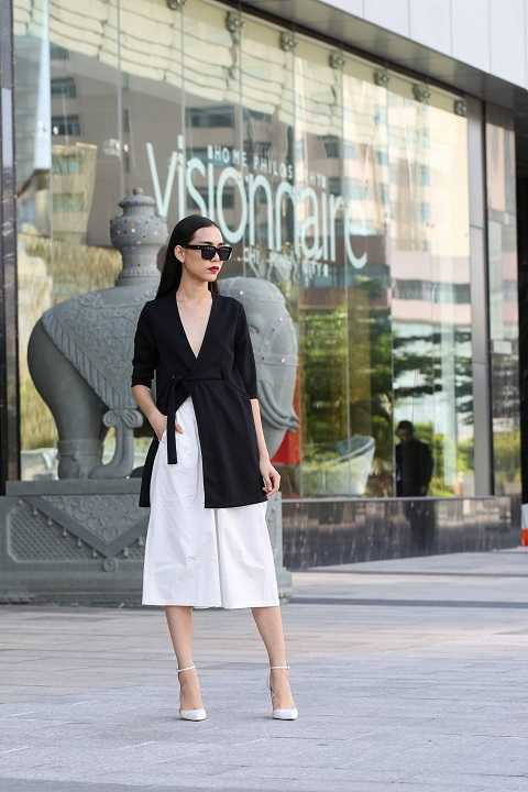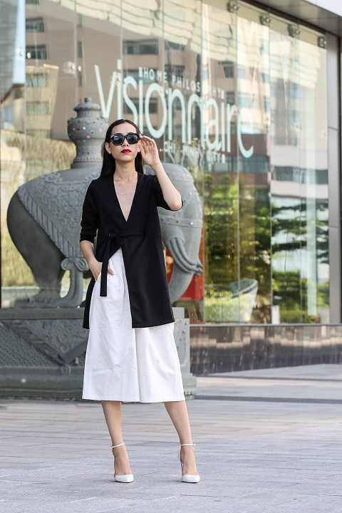 Do là quần trắng nên Thanh Tuyền đã chọn áo khoác dài để bộ đồ trông lịch sự hơn. Áo đắp vạt cổ điển với tông màu đen giúp bạn thêm chín chắn. Set đồ có thể giúp bạn tự tin đi thẳng từ chỗ làm tới các buổi họp hành, gặp gỡ hay tiệc tùng.