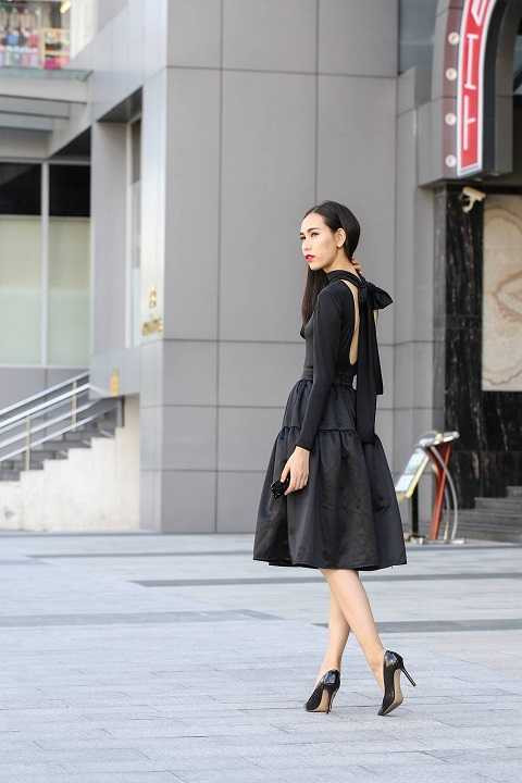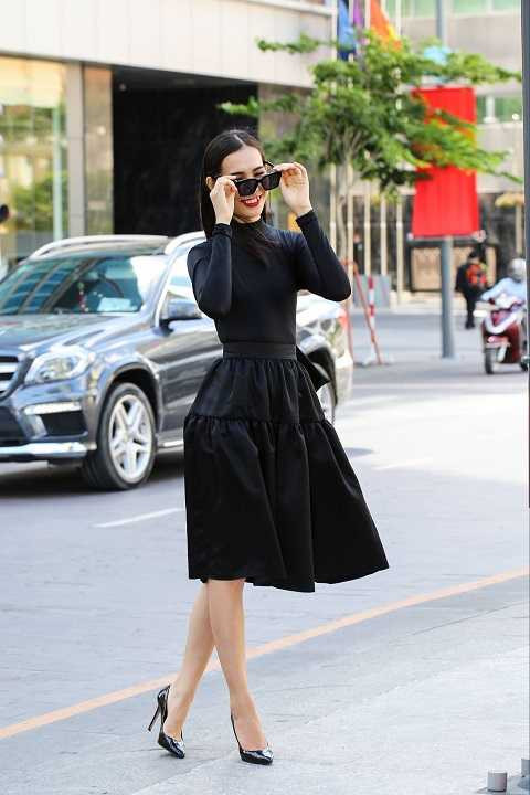 Phong cách black-on-black cũng rất được Thanh Tuyền "sủng ái". Cô thường xuyên ton-sur-ton đen khi đi tới mọi sự kiện kể cả những hoạt động, công việc hàng ngày. Là người thích phong cách cổ điển nên áo cổ lọ, váy xoè chắc chắn là những item không thể thiếu trong tủ đồ của Thanh Tuyền.