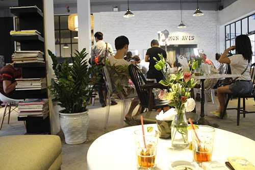 Mò mẫm hết 2 lượt cầu thang còn lổn nhổn bụi cát, tôi đi qua một hành lang dài với những khung cửa sổ không có chấn song nhìn ra khoảng sân rộng bên cạnh rợp bóng cây, tràn ngập ánh nắng. Quán café điểm hẹn nằm ở cuối dãy hành lang, đi chung cửa với một cửa hàng quần áo thời trang tự thiết kế. Trái với vẻ vắng lặng bên ngoài, trong quán là cả một đám đông ồn ào, náo nhiệt. Hầu hết “thượng đế” tới đây là các bạn trẻ, ăn mặc sành điệu với đủ các loại mốt thời thượng. Ngay gần lối ra vào, một khoảng rộng xúm xít người đang ngó nghiêng quanh “trường quay” thực hiện MV ca nhạc của một cô ca sĩ trẻ vừa bước ra từ cuộc thi âm nhạc truyền hình ăn khách. Tiếng nhạc nền, bàn tán, tạo nên một bầu không khí sôi động.